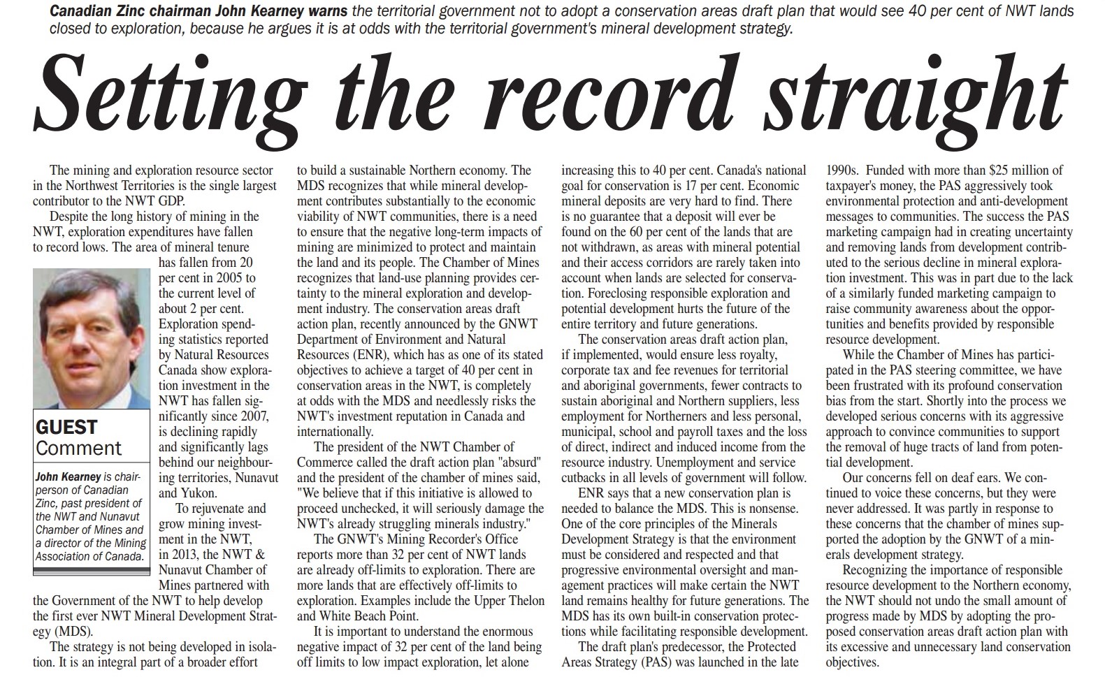Recent Editorial: SETTING THE RECORD STRAIGHT, by John Kearney, Canadian Zinc