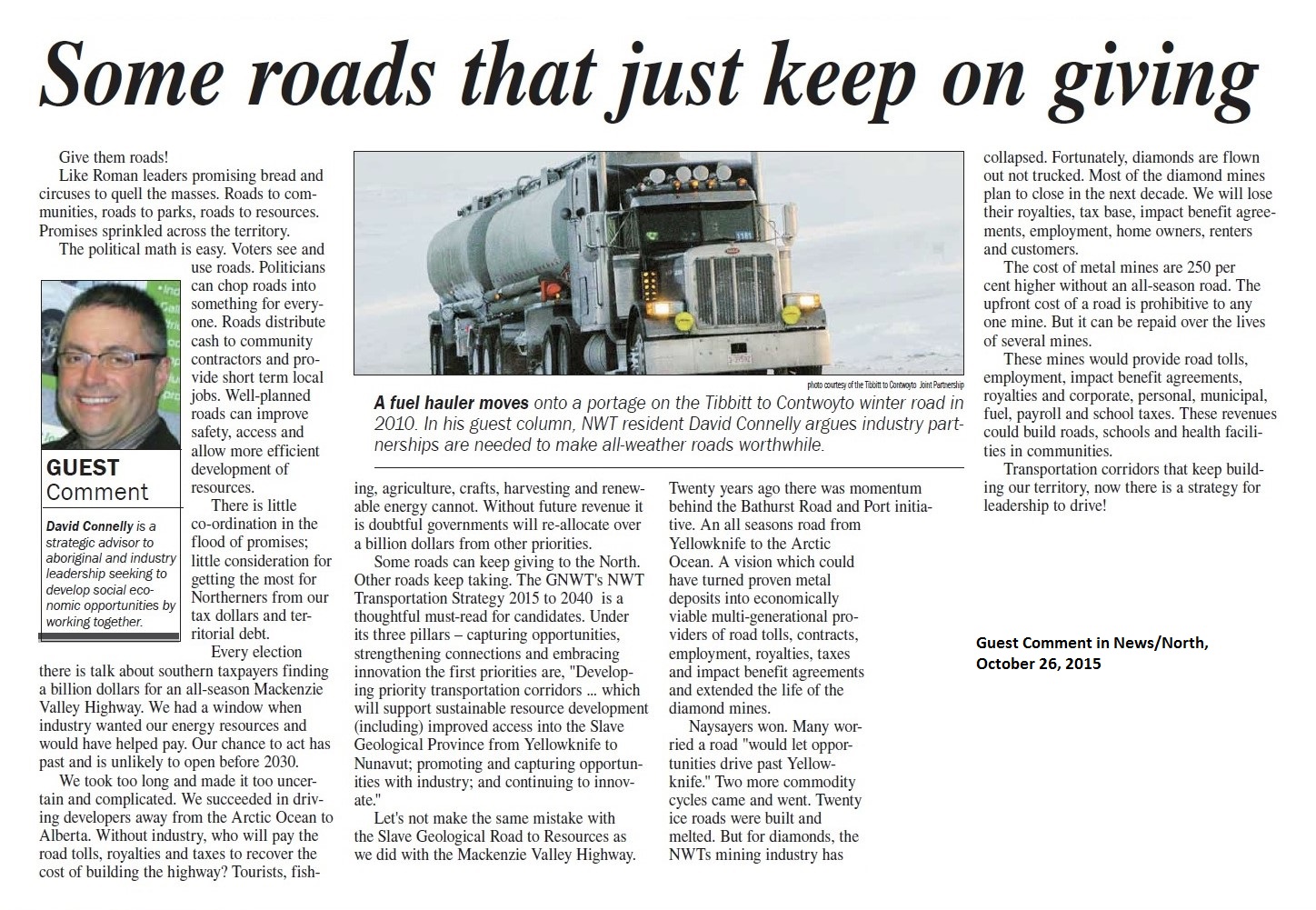 Some roads can keep giving to the North. Other roads keep taking. The GNWT's NWT Transportation Strategy 2015 to 2040 is a thoughtful must-read for candidates. Under its three pillars – capturing opportunities, strengthening connections and embracing innovation the first priorities are, "Developing priority transportation corridors ... which will support sustainable resource development (including) improved access into the Slave Geological Province from Yellowknife to Nunavut; promoting and capturing opportunities with industry; and continuing to innovate."