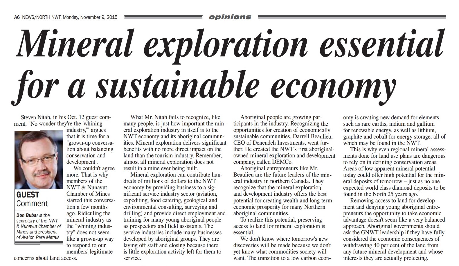 News/North, November 9, 2015, Guest Comment, by Donald Bubar is the secretary of the NWT & Nunavut Chamber of Mines and president, Avalon Rare Metals